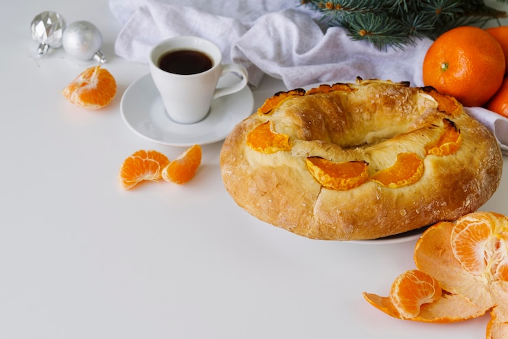- На остывший пирог выкладываем карамелизированные апельсины, формируя елочку, и декорируем шоколадной стружкой.
