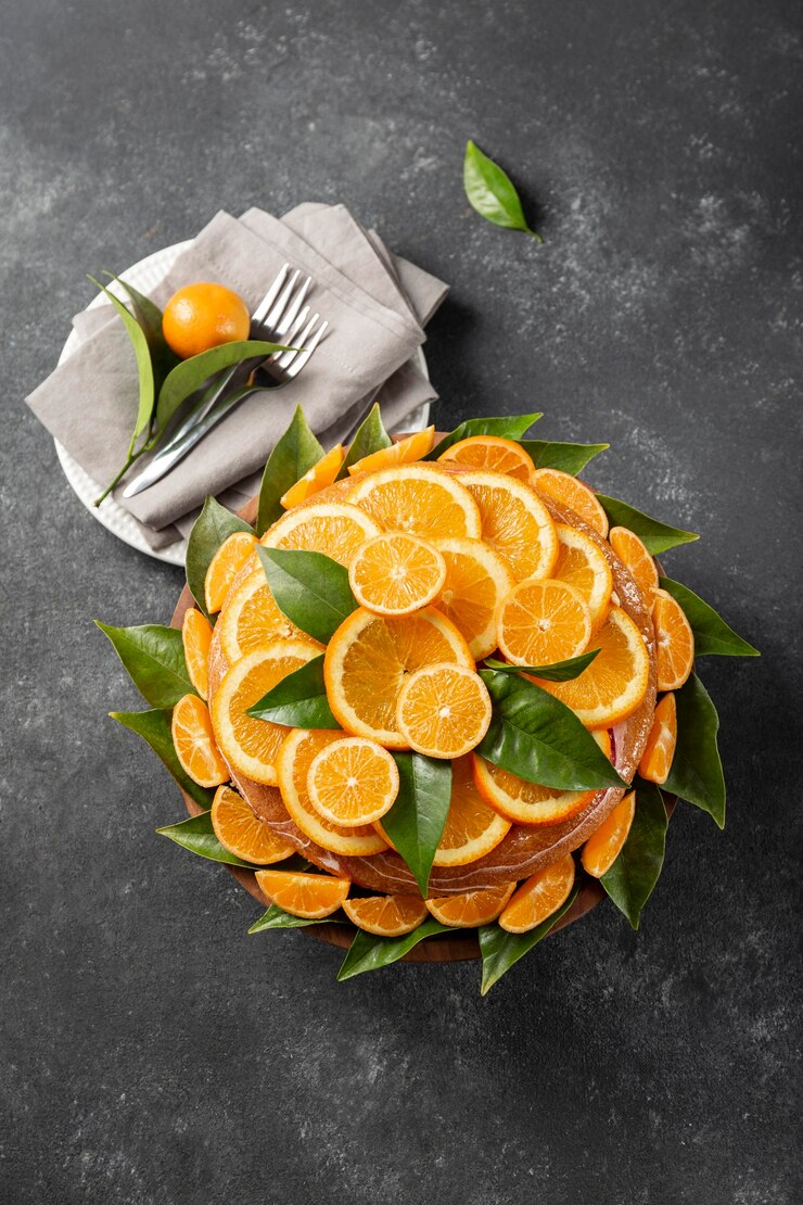 - Необходимо очистить апельсин от кожуры и нарезать его на четыре части, затем разложить сверху на тесте.