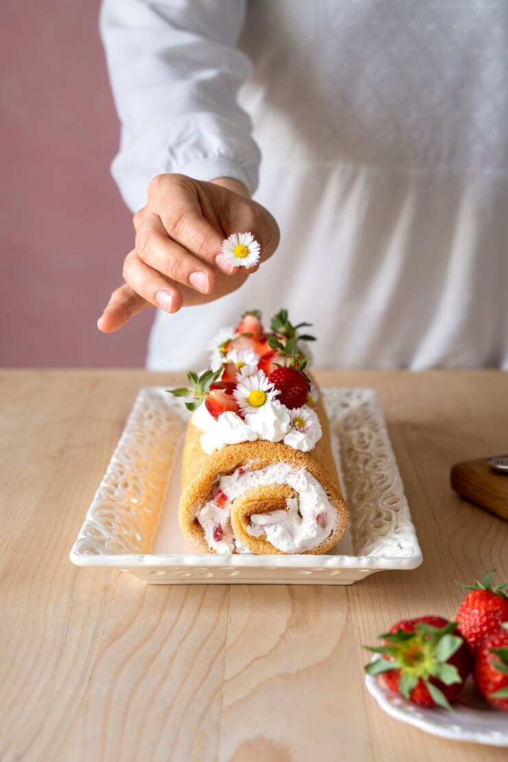 - Аккуратно заверните рулет, подворачивая края пергамента. Затем оберните его вторым слоем пергамента и поместите в холодильник на 2 часа. После застывания переложите рулет на декоративную доску.