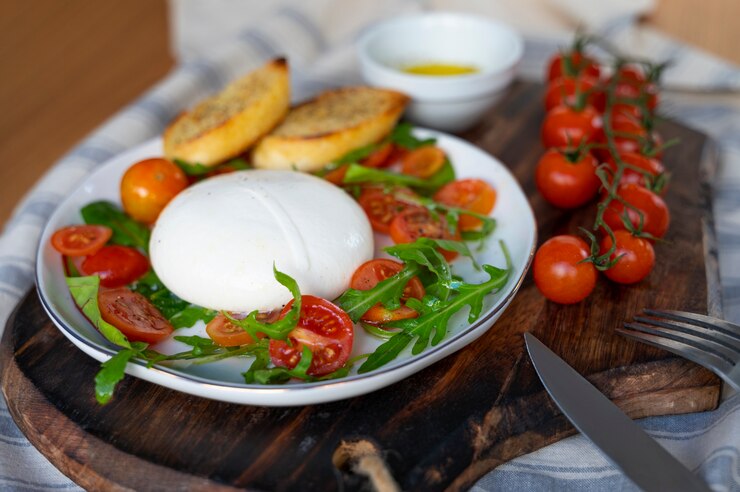 - Добавьте помидоры и раскрошенный сыр буррата.