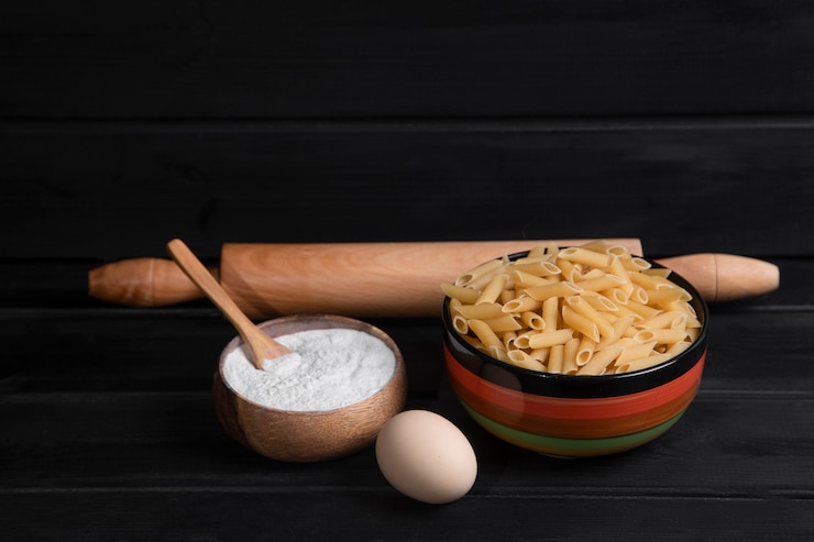- Необходимо соединить манную крупу с солью, сформировать из нее горку в миске (или на столе), затем сделать углубление в центре и вылить туда желтки.