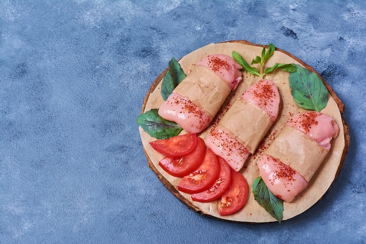 - Куриную грудку обжариваем на сковороде по две минуты с каждой стороны, до побеления мяса).