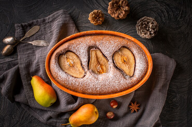 - На основу выкладываются ломтики груш, которые затем посыпаются измельченным миндалем.