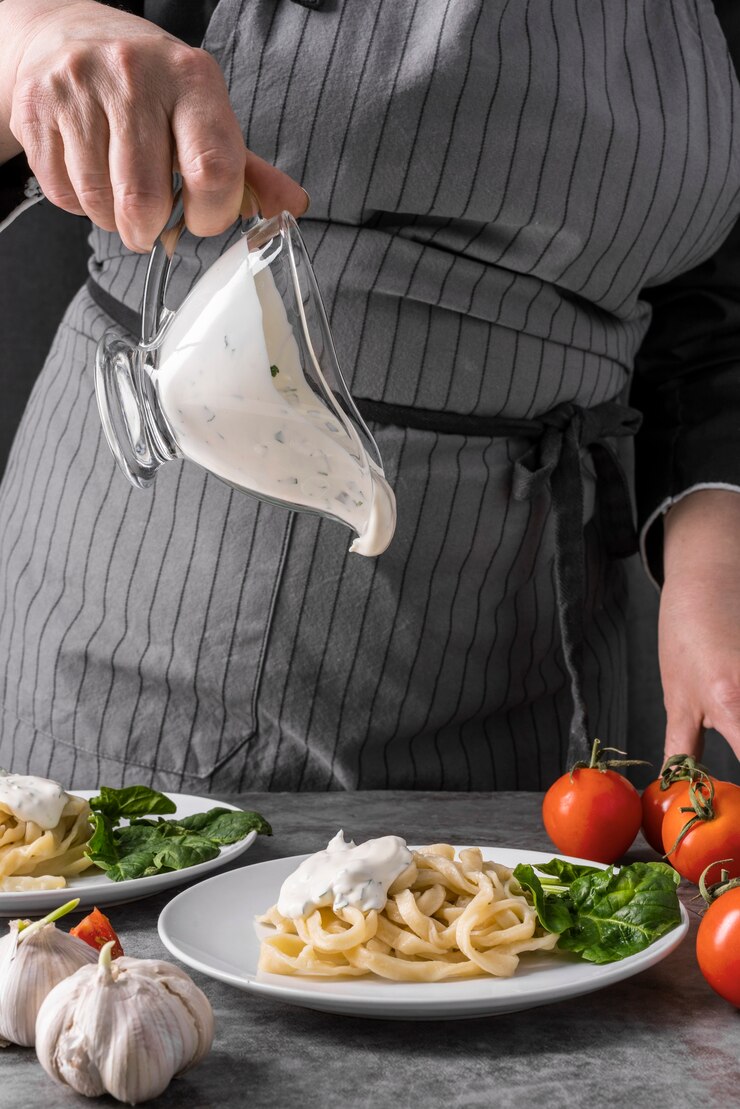 Перед подачей необходимо полить спагетти соусом, посыпать тертым сыром и зеленью.