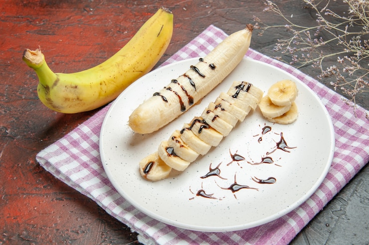 - Переливаем карамельную воду в другую емкость и даем ей немного остыть. Пока сироп остывает, очищаем бананы и нарезаем их на кружочки толщиной 4-5 мм.