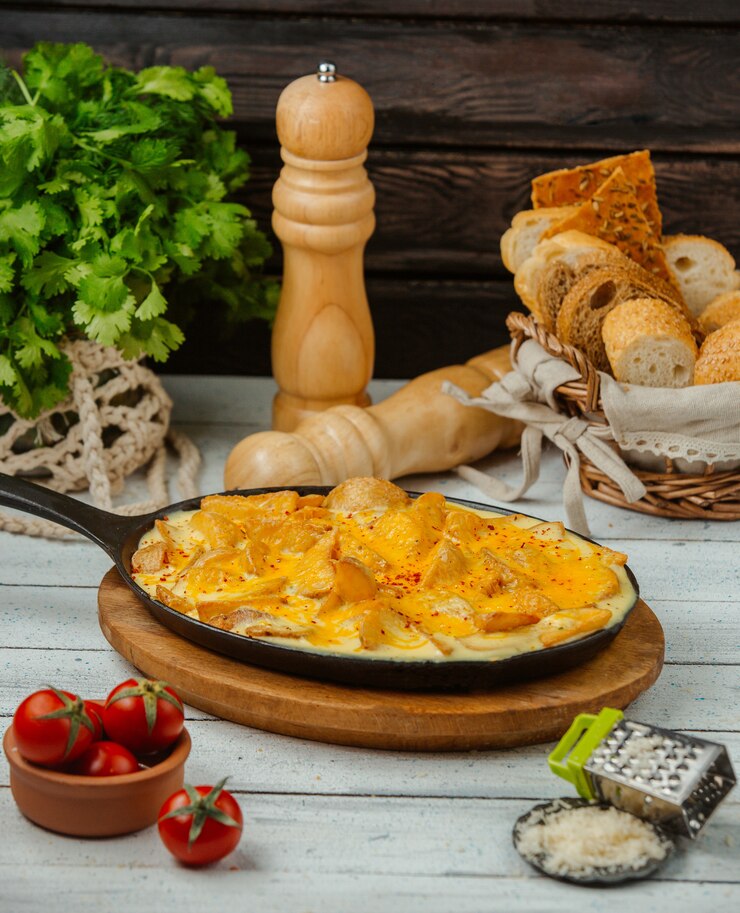 - Определите готовность блюда, проверяя мягкость картофеля – если он мягкий, значит, блюдо готово к подаче. Аккуратно переложите его на сервировочное блюдо и нарежьте на порционные куски.