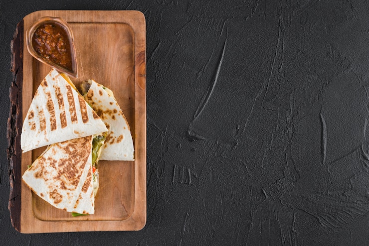 - На одну половину тортильи равномерно распределяем сыр, затем выкладываем мясной фарш с овощами. Поверх фарша снова посыпаем сыром и накрываем второй половиной тортильи.