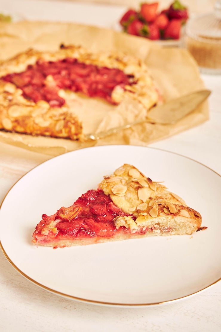 - Смешать с нарезанной кубиками клубники. Выложить в форму и равномерно распределить. Сверху украсить половинками клубники, расположив их срезом вверх и слегка вдавив в тесто.