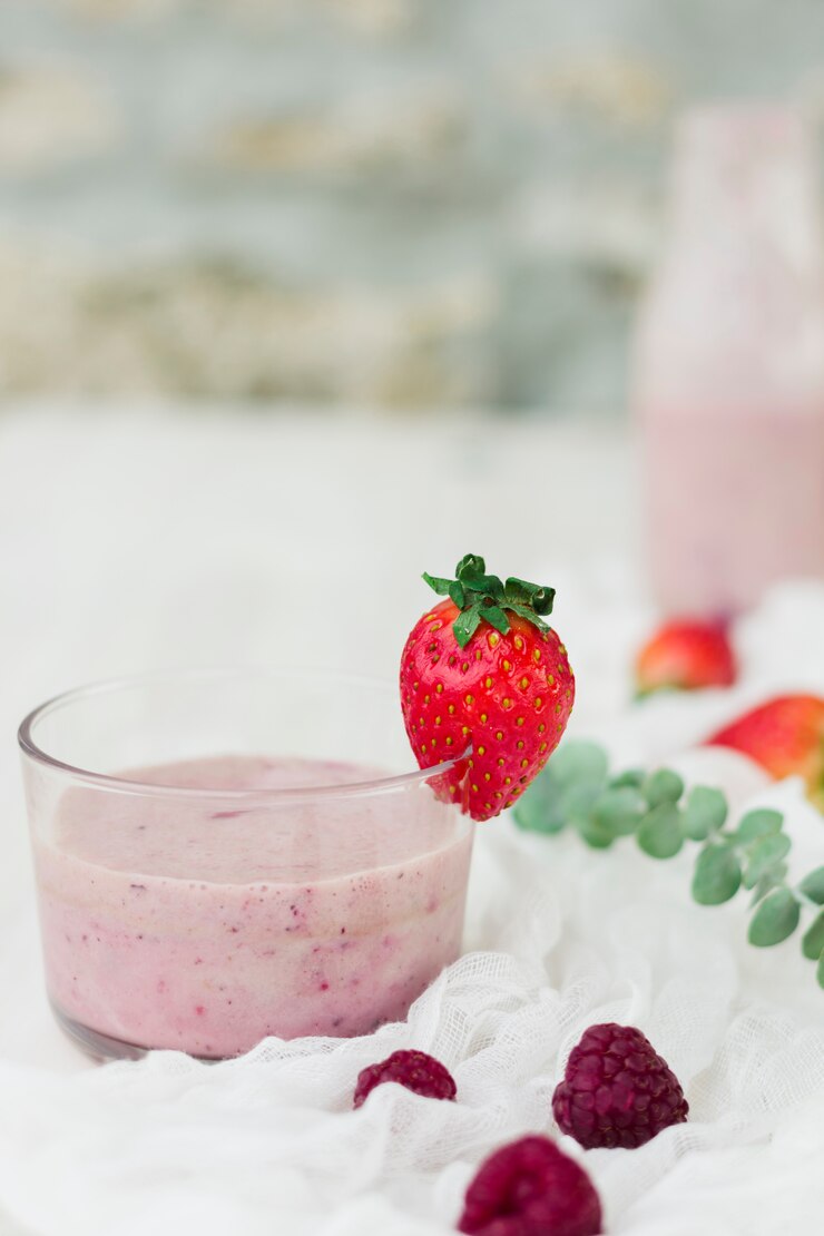- Клубнику измельчаем погружным блендером до состояния пюре. Для приготовления пюре можно использовать как свежую, так и замороженную клубнику. Если косточки в клубнике крупные, рекомендуется протереть пюре через сито.