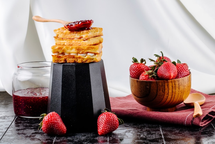 - Выложите печенье слоями, промазывая кремом, ягодами и поливая малиновым сиропом.