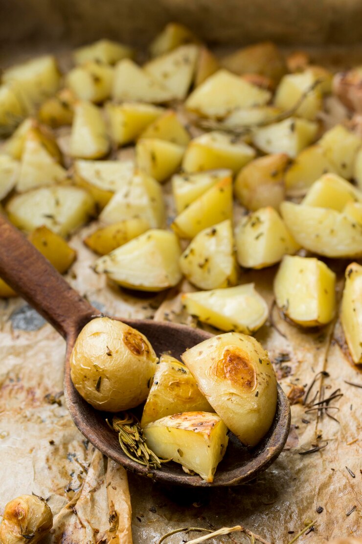 - Разрежьте картофель на половинки и смажьте каждую половинку ароматной смесью.