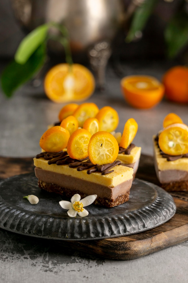 - Чтобы приготовить мандариновое конфи, желатин необходимо замочить в холодной воде и перемешать, после чего оставить на 10 минут. В сотейник наливают свежевыжатый мандариновый сок и добавляют сахар. Сотейник ставят на средний огонь и доводят до кипения. Затем его снимают с огня и добавляют разбухший желатин, тщательно перемешивая до полного его растворения. Дно колец диаметром 16 и 12 см затягивают пищевой пленкой, помещают на ровную поверхность, например, на разделочную доску. В кольцо диаметром 16 см выливают 250 г мандаринового конфи, а оставшуюся массу – в кольцо диаметром 12 см. После этого десерт убирают в холодильник на 2-3 часа.