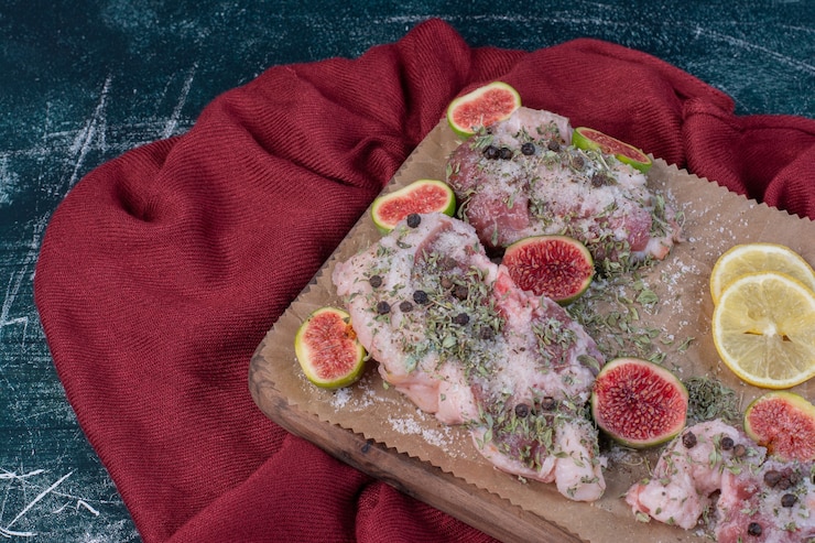 - сначала мясо необходимо нарезать на куски, подобные отбивным, и слегка отбить. Затем посолите его и добавьте специи по вашему вкусу.
