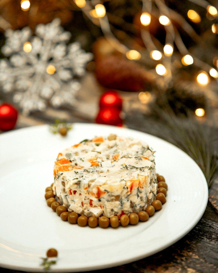 Изысканный новогодний салат Оливье, украшенный в виде петуха.