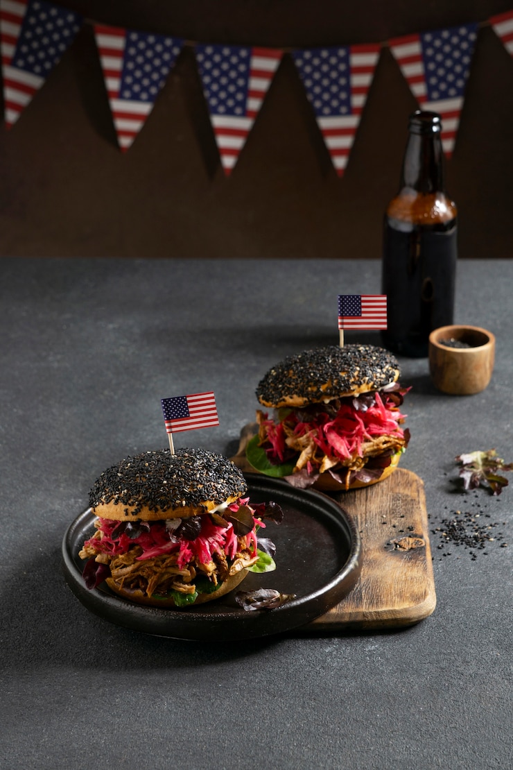 - В меню предлагаются бургеры, подаваемые с жареным картофелем и свежими овощами (по желанию — другой гарнир).