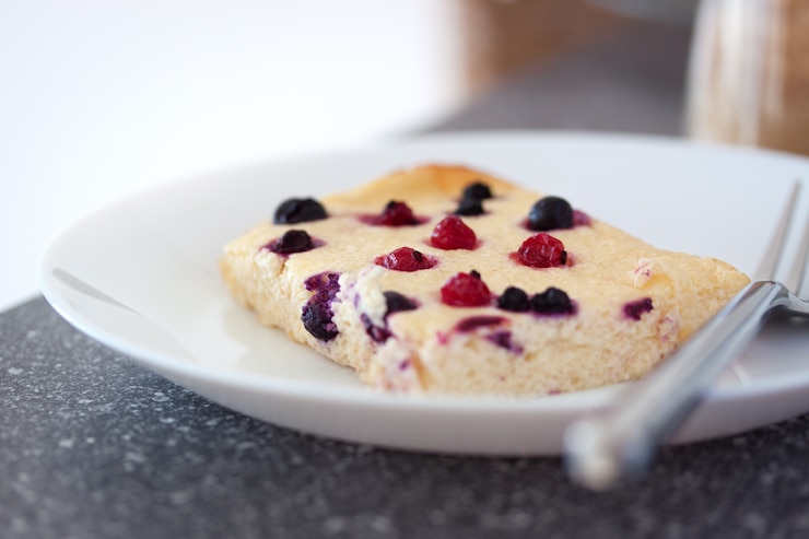 - Выложите ягоды на тесто и перелейте его в форму. Учитывая жидкую консистенцию теста, ягоды опустится на дно. По желанию, их можно сразу разместить на дне формы.