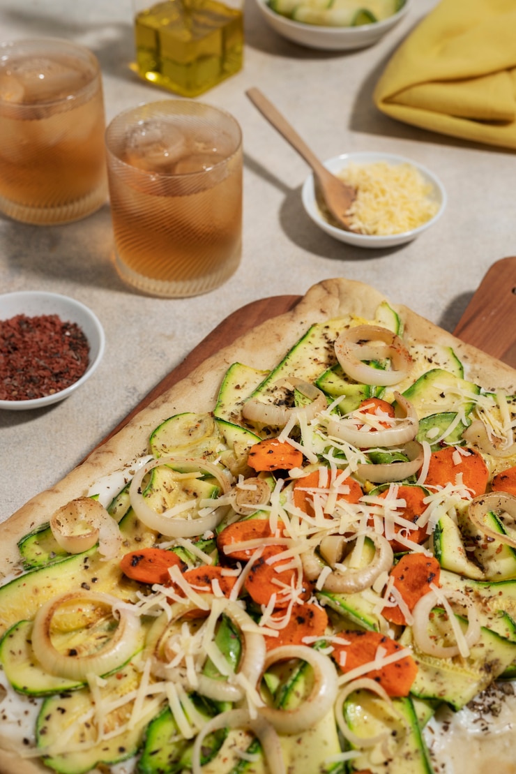 - На готовую основу выкладывают нарезанные томаты, маслины, острый перец, вяленые томаты, а сверху посыпают тертым сыром.