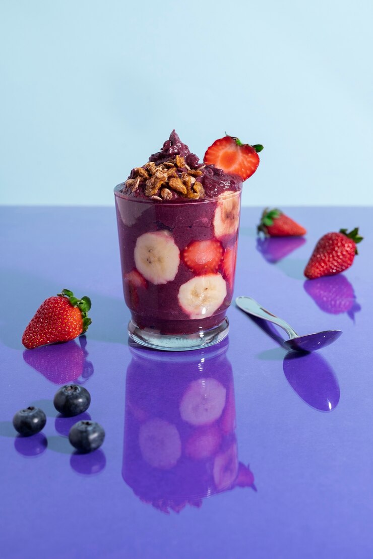 - Смешайте клубнику, молоко и мороженое в блендере.