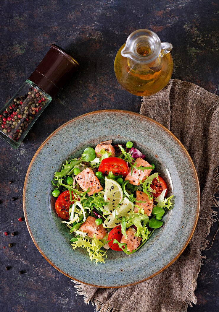 - Разложи сверху дольки апельсина и полукольца красного лука. После этого удали кожуру с лосося, разомни его руками и добавь в салат. Вот и все, салат готов!