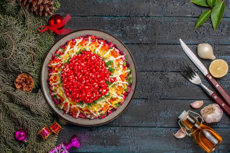 - Натрите твердый сыр на терке, посыпьте им блюдо, сверху выложите салат и добавьте оставшуюся часть сыра.