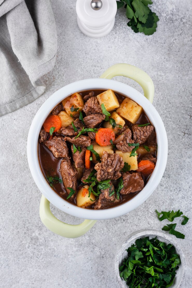 - Необходимо добавить морковь и картофель, залить пивом и тушить до готовности картофеля в течение 20-25 минут.