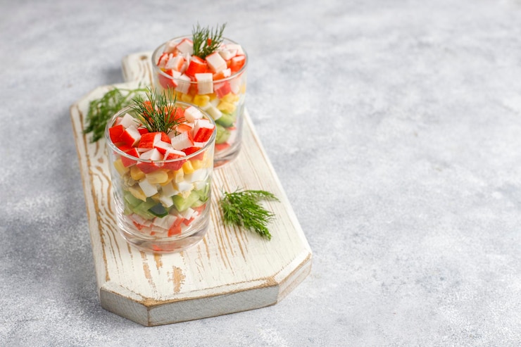 Популярные крабовые палочки хорошо сочетаются с множеством ингредиентов в различных блюдах. салатов, подходящие как для праздничного стола, так и для обычных дней. обед Вечерний перекус с таким блюдом будет великолепным. Предлагаем вам салат с крабовыми палочками, рисом и огурцом – классический вариант.
