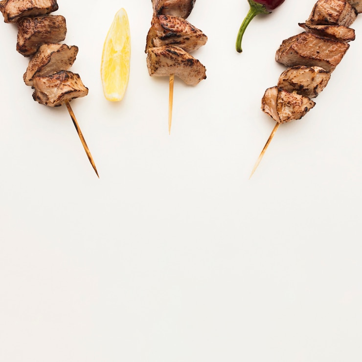 - Мясо следует нанизать на шпажки, предварительно обернув их концы фольгой для предотвращения пригорания).