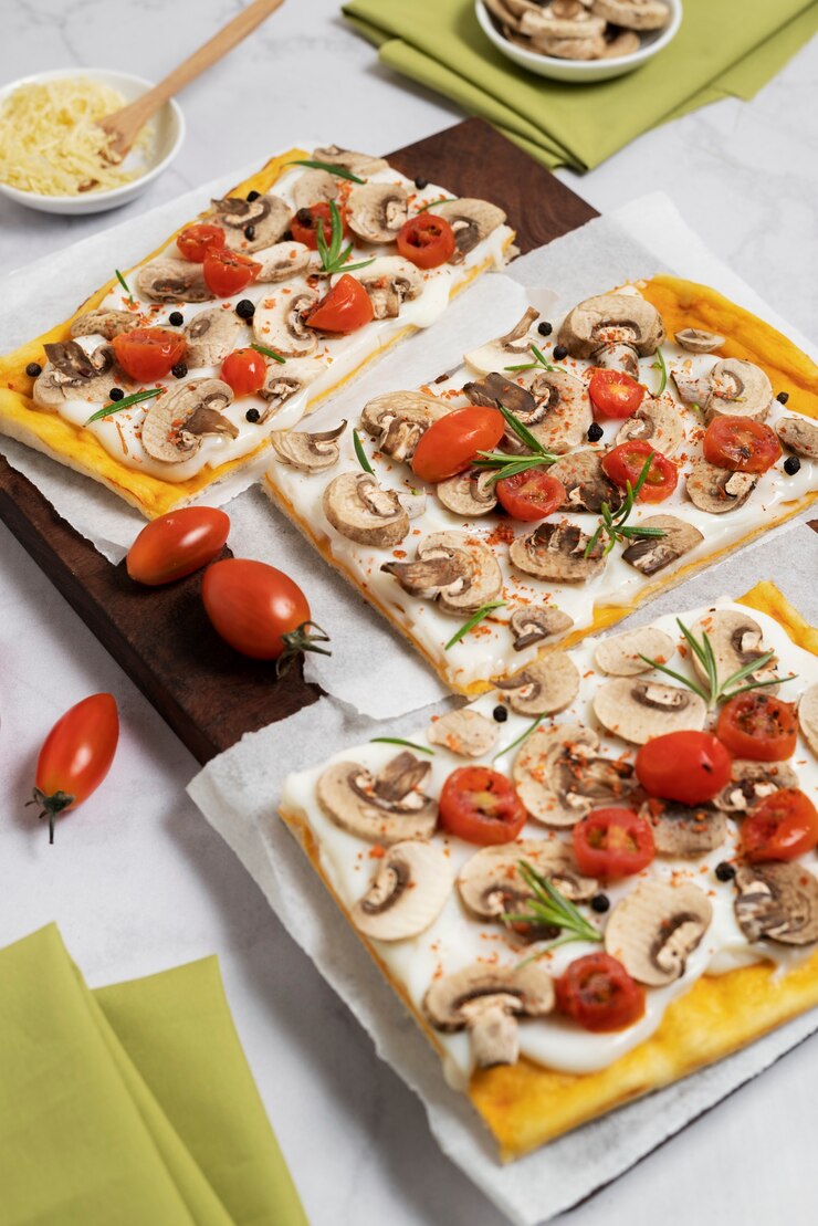 - Готовый салат аккуратно снимаем с формы и декорируем по желанию. Я украсила его кусочками помидоров, грибами, петрушкой и листовым салатом.