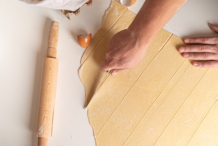 - Разделите подготовленное тесто на 8-10 частей и сформируйте из них изделия в виде «морковки». Каждый такой полуфабрикат раскатайте в треугольник.