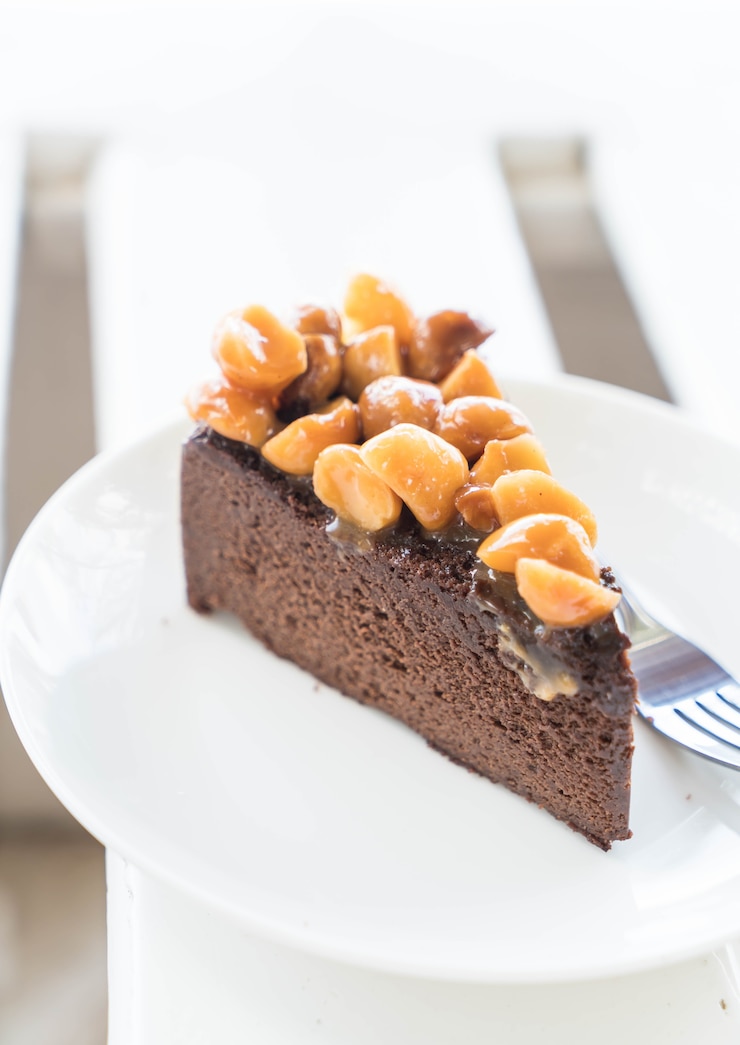 - Срежьте края остывшего коржа. После этого разделите его на одинаковые квадраты. Возьмите один корж и поместите его на блюдо. Обильно смажьте верх кремом. Положите сверху второй корж. Равномерно распределите по нему карамель. Затем выложите очищенный арахис. И только после этого нанесите слой крема. Третий и четвертый коржи также обильно смажьте кремом. Кроме того, покройте кремом все боковые стороны. Сверху посыпьте измельченным арахисом, а бока можно украсить оставшимся бисквитом.