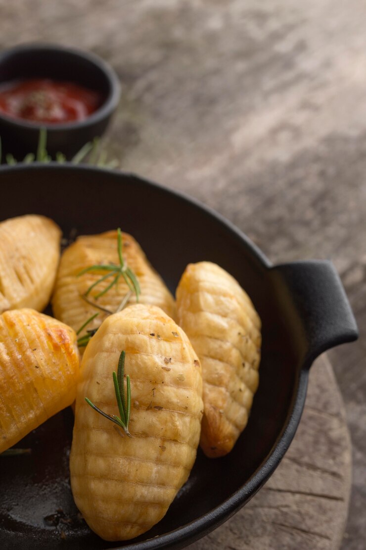 - Начинка помещается внутрь половинок картофеля, после чего они соединяются.