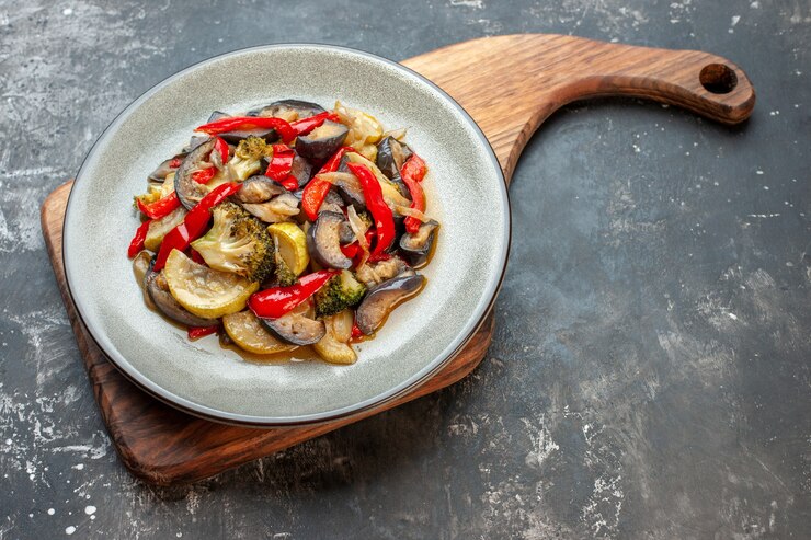 - Накрываем сковороду крышкой и тушим на медленном огне около 10 минут. Затем перекладываем содержимое в салатницу, добавляем немного оливкового масла и перемешиваем.
