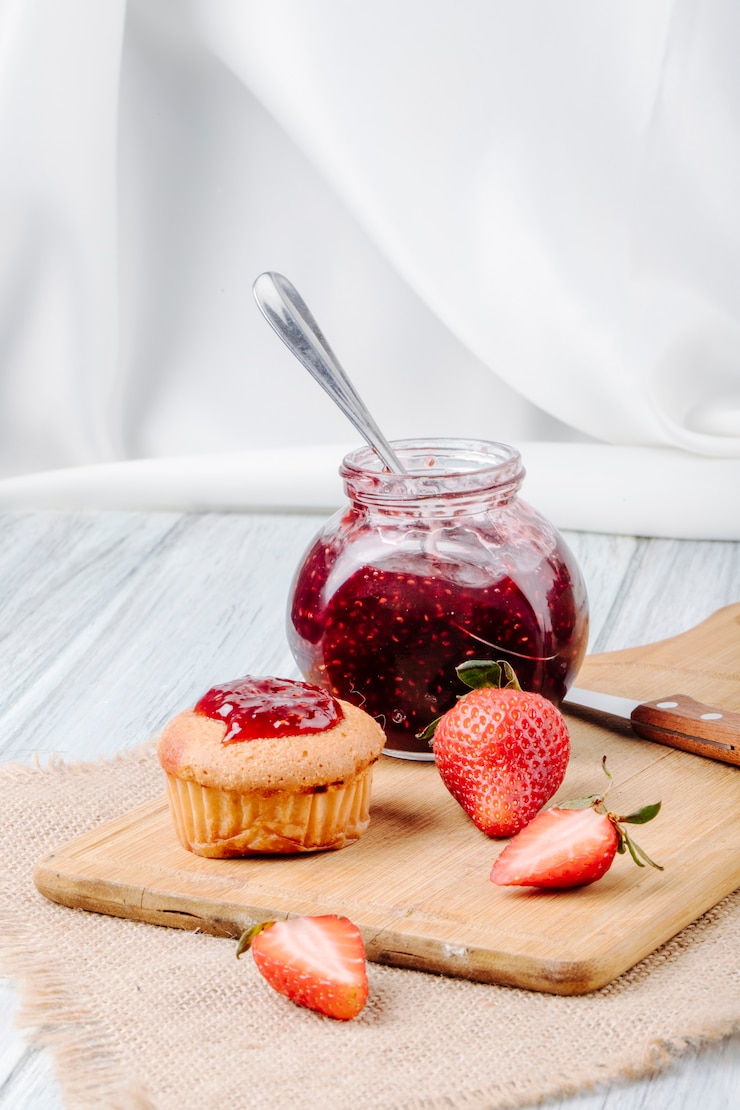 - Повторяем процедуру с клубничным вареньем: подогреваем его до кипения на плите, а затем варим ещё одну минуту. Снимаем с огня.