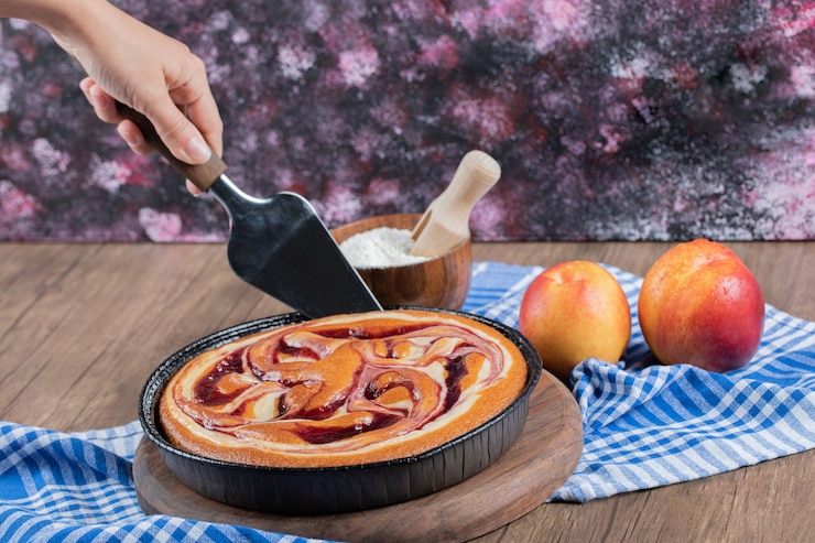 - Смазать форму маслом. Выложить яблоки, сверху разложить тесто. Заварной крем переложить в пакет, обрежёт его край. На тесто выложить крем фигуркой спирали.