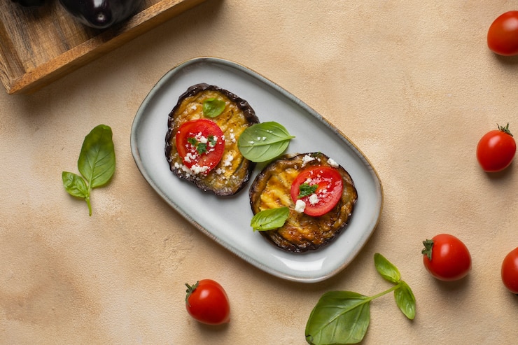 - Наше блюдо из баклажанов с помидорами и сыром готово. Перед тем, как подавать его к столу, украсьте зеленью укропа или базилика.