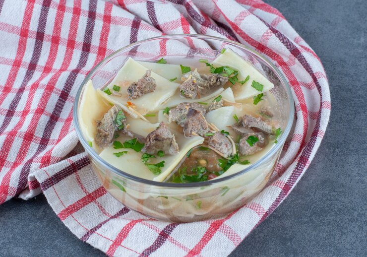 - Желатин растворяют в горячем бульоне, затем процеживают.