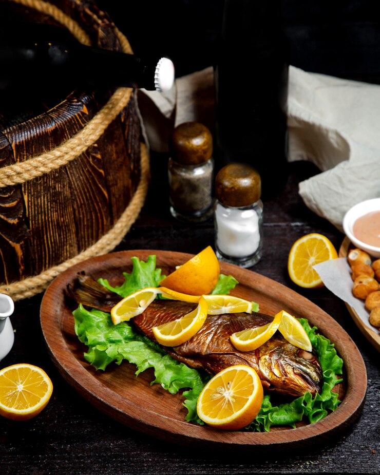- Положить сверху скумбрию, начинить её петрушкой, накрыть фасолью, посыпать чесноком, перцем, солью, мускатным орехом и полить уксусом.