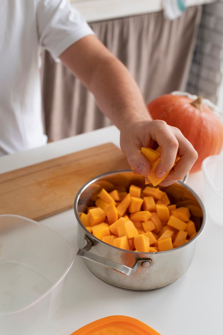 - Тщательно выдавливаем из тыквы лишнюю жидкость.